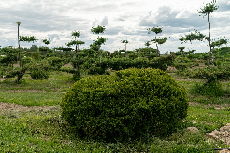 Сорт известен своей сочной светло-зелёной хвоей, плотной и мягкой по структуре. В карикоми-форме куст выглядит как зелёное облако с чётким контуром — визуально лёгкое, но при этом прочное и стабильное.
