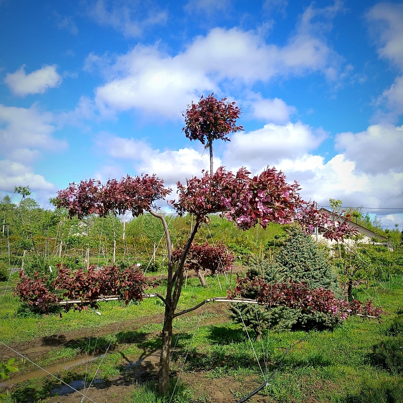 Яблоня Недзведского в форме ниваки — это уникальное сочетание ботанической редкости и восточной эстетики. Сорт знаменит своей пурпурной древесиной, тёмно-бордовыми листьями и рубиновыми плодами. А в форме ниваки он превращается в живую скульптуру, созданную по законам японского садового искусства.